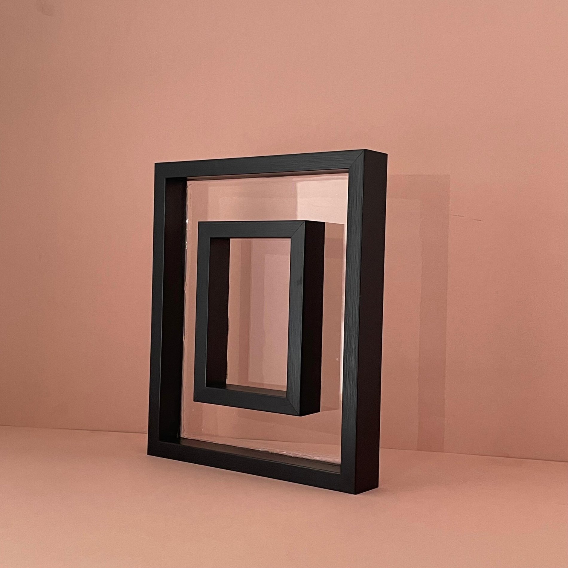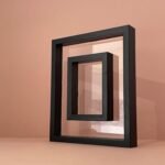 A layered, deep-set frame that creates a visually dynamic floating effect for items inside. -