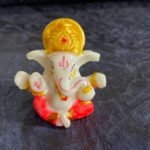 Lord Ganesha, honored in Indian culture for wisdom and success, is depicted seated with a gentle smile, holding a modak and raising his hand in abhaya mudra. The murti’s white base signifies purity and peace, while gold and red detailing add a festive, sacred aura.