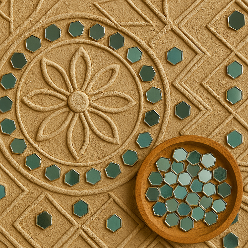 These tiny Hexagonal mirrors are a staple in traditional Gujarati Lippan art. Artists embed them into wet clay or white cement on walls to create eye-catching reflective murals that shimmer in the light. Perfect for home décor, cafes, and heritage-style interiors.