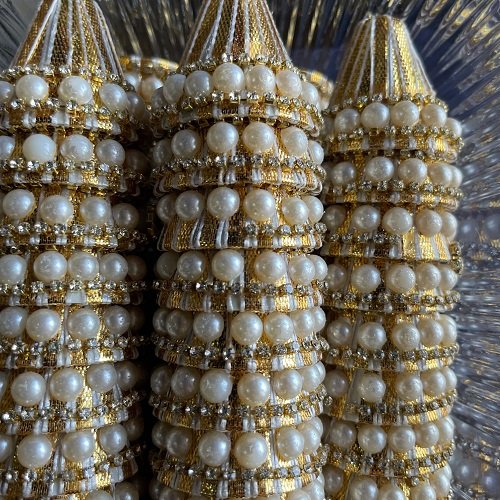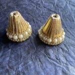 Add a regal touch to your festive creations with our Moti Cap Golden embellishments – beautifully handcrafted accessories designed for weddings, decor, fashion design, and traditional Indian crafts. These cone-shaped caps are made from shimmering golden gota fabric and delicately adorned with a ring of lustrous white pearls (moti) at the base, combining sparkle and sophistication in one stunning design.